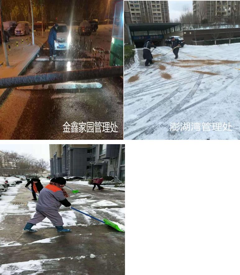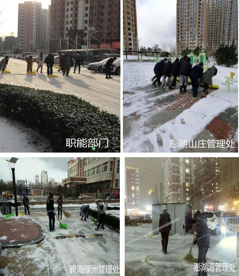 12月6日,烟台迎来了2018年的第一场雪,人们沉浸在迎接瑞雪的喜悦里。此时,谈球吧物业公司考虑到雪后路面积雪积冰造成的走路难、开车难的问题,本着为业主做好全方位服务的原则,在公司高管和各管理处负责人的带领下,从深夜开始,组织全体员工冒着大雪,顶着寒风,打扫路面积雪,清理薄冰,从澎湖湾到澎湖山庄、碧海绿洲、金鑫家园到德蚨家园,从员工到领导,全员上岗清理路面,为业主提供了安全畅通的通行环境,赢得业主的一致好评,也成为了烟台市一道靓丽的风景线。